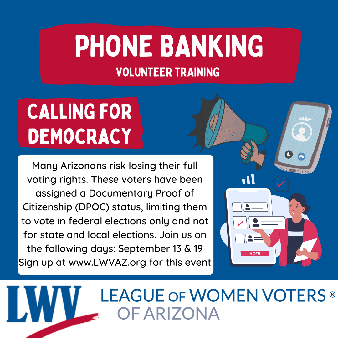 LWVAZ has partnered with One Arizona to take action on this issue by notifying Arizona voters on the DPOC list about their current status and urging them to check their registration status prior to the next election. We need YOUR help with this critical outreach, which will be done through phone banking efforts beginning in September and October.
